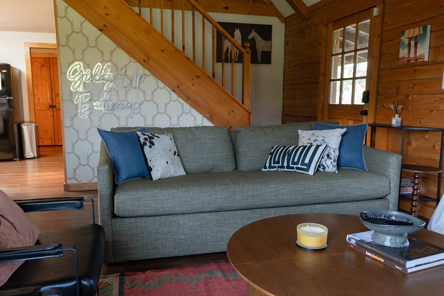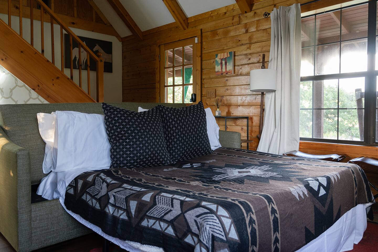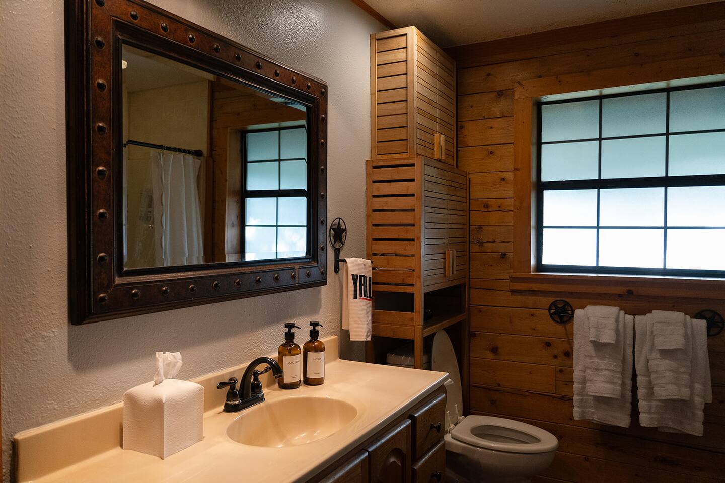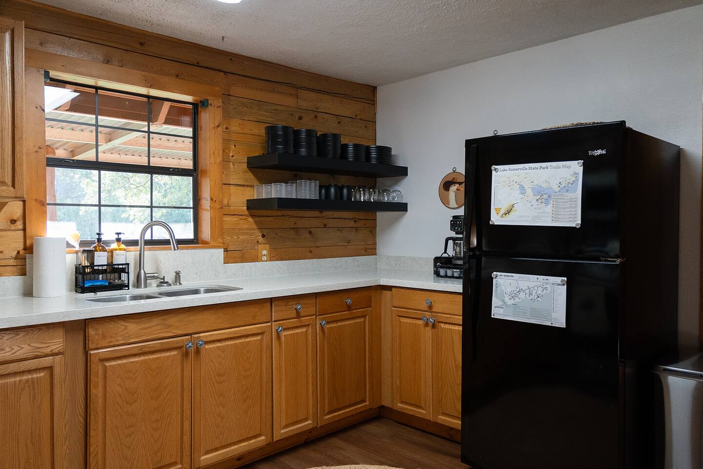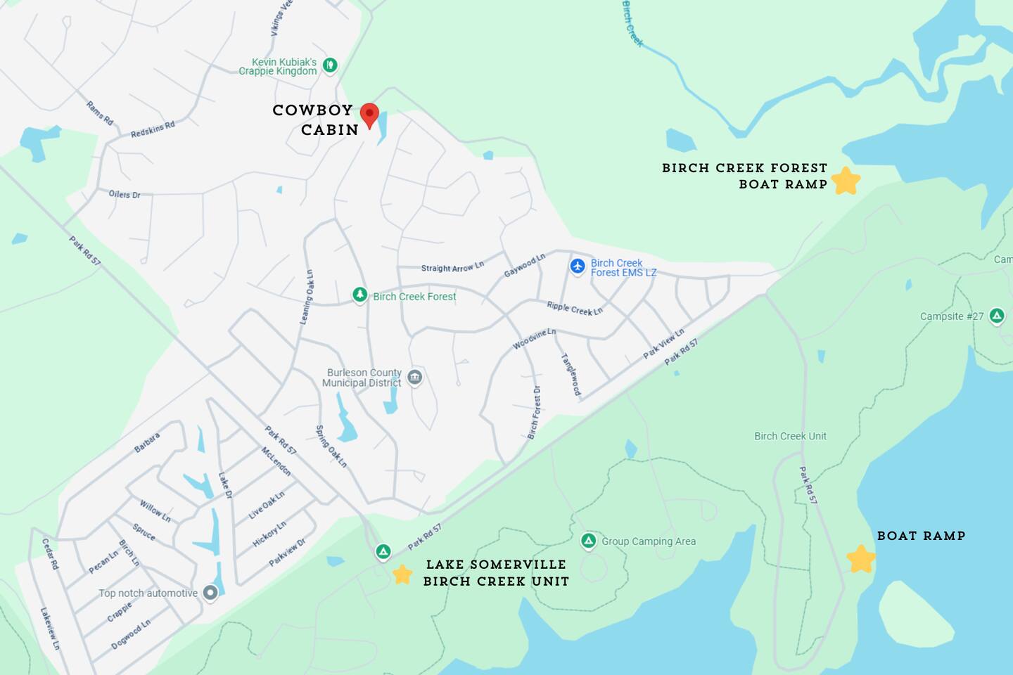 <b>Welcome to Cowboy Cabin — your rustic escape in the Texas countryside.</b> Nestled in Somerville, this cozy retreat offers a peaceful, down-to-earth setting with all the comforts you need for a relaxing getaway, whether you're here to unplug, explore the lake, or enjoy a quiet weekend under the stars. <b>The well-stocked kitchen includes:</b> → <b>Modern appliances</b> including full-size refrigerator, oven, and stove top. Please note that there is no dishwasher. → Coffee enthusiasts will love the <b>Keurig and regular coffee maker</b> options → <b>Blender, toaster, slow cooker and essential kitchen utensils</b> for all your cooking needs → Wine glasses and a wine opener for an evening of relaxation <b>Sleeping arrangements:</b> → <b>Bedroom #1</b> (Ground floor): King-size bed —no stairs required → <b>Bedroom #2</b> (Second/Loft floor): King-size bed, open space → Additional sleeping: One pull out couch in the living area for extra guests <b>Perfect for families and friends:</b> Located just minutes from <b>Somerville State Park, Birch Creek Unit</b>, this home offers the perfect mix of relaxation and adventure. Whether you’re hosting a family BBQ with the charcoal grill or unwinding in the hammock, this home has everything you need for the ultimate country getaway.